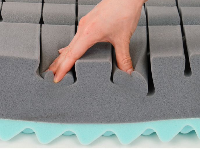 キューブ状のウレタンフォームで体圧を吸収・分散。上層のやわらかいキューブが頭・背中・脚をソフトに支え、心地よい硬さのベース層が腰の沈み込みを防いで、理想的な寝姿勢をサポートします。